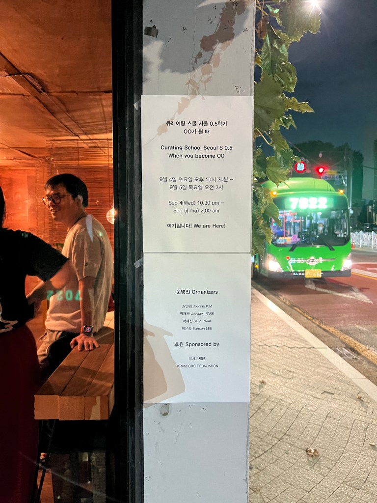 22024년 9월 4일 밤 10시 30분부터 다음 날 오전 1시 30분까지, 큐레이팅 스쿨 서울 0.5학기의 첫 번째 ‘수업’이 열렸습니다. “OO이 될 때”라는 제목 아래 모여 자신의 이야기를 공유한 여섯 명의 큐레이터는 다음과 같습니다: 차오지아싱, 최상호, 이민지, 죠앤킴, 박재용, 큐리. 세 시간 동안 이어진 대화에는 50여 명의 참가자들도 함께 했습니다. 행사가 열린 청운동에서 멀지 않은 삼청동에는 늦은 시각까지 삼청나이트의 여러 행사와 파티가 이어졌지만, 앞선 행사를 모두 마친 뒤 마지막 행선지로 큐레이팅 스쿨 서울의 “OO이 될 때”를 찾아주신 분들도 있었습니다.